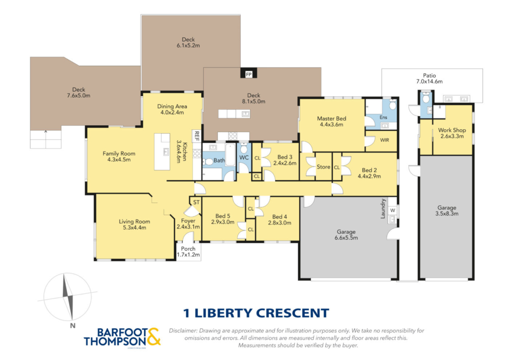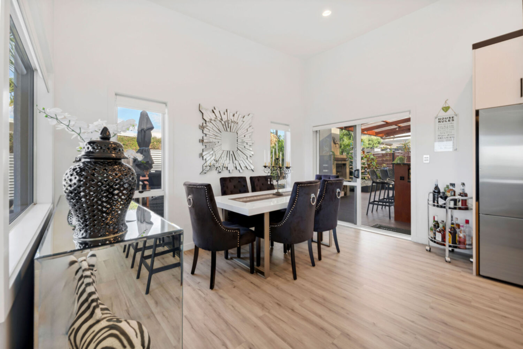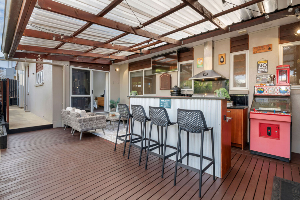 Centre stage, the open-plan kitchen, dining, and lounge is flooded with northern light and flows effortlessly to a covered outdoor kitchen and bar area — complete with bar fridges, BBQ, deep fryer, TV, and even an outdoor fireplace. Whether it’s a lively get-together or a quiet evening, this space is extraordinary in every sense. A separate covered outdoor lounge adds another spot to relax, while an internal lounge provides the perfect place for movie nights or family gatherings
