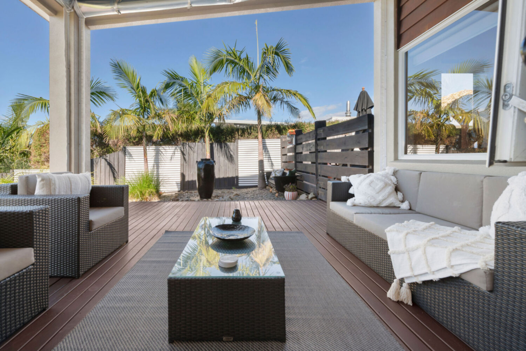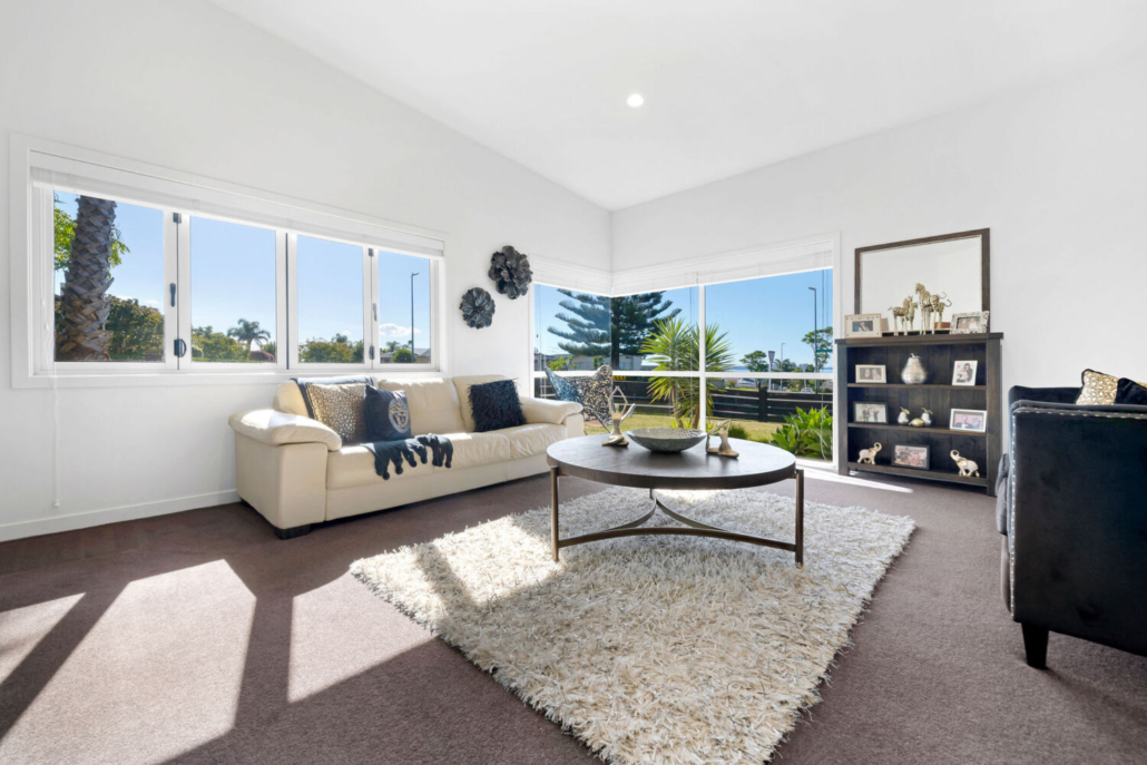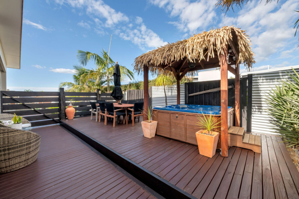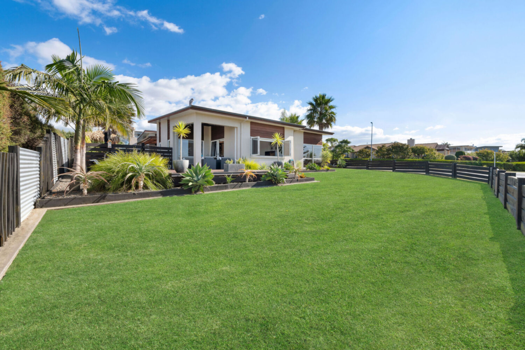 Outdoors, the extras keep coming: large lawns for kids and pets, a spa pool, multiple sunny spaces to enjoy the day, and those added sea views that remind you you’re living on the coast.