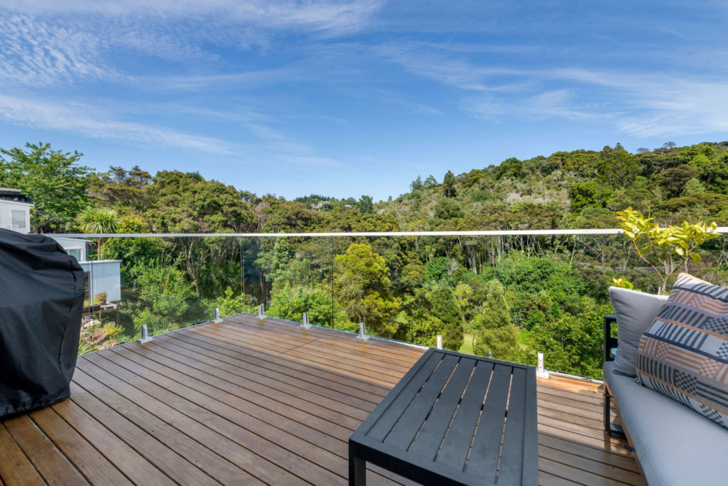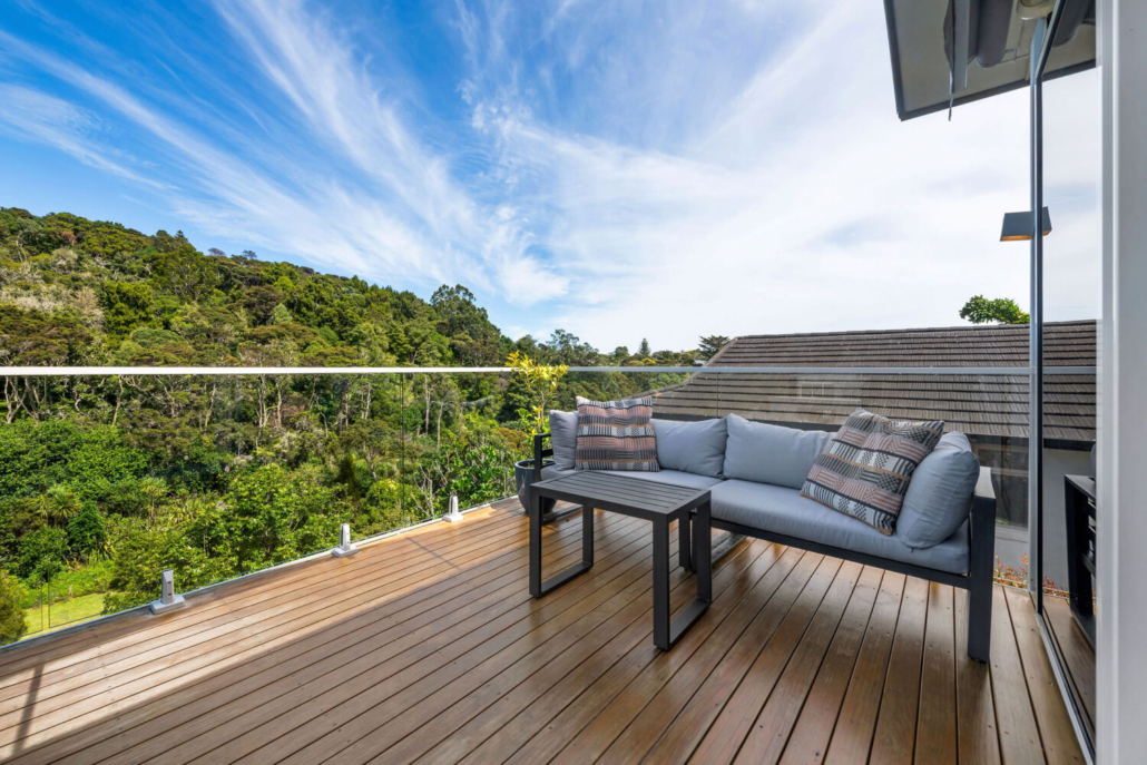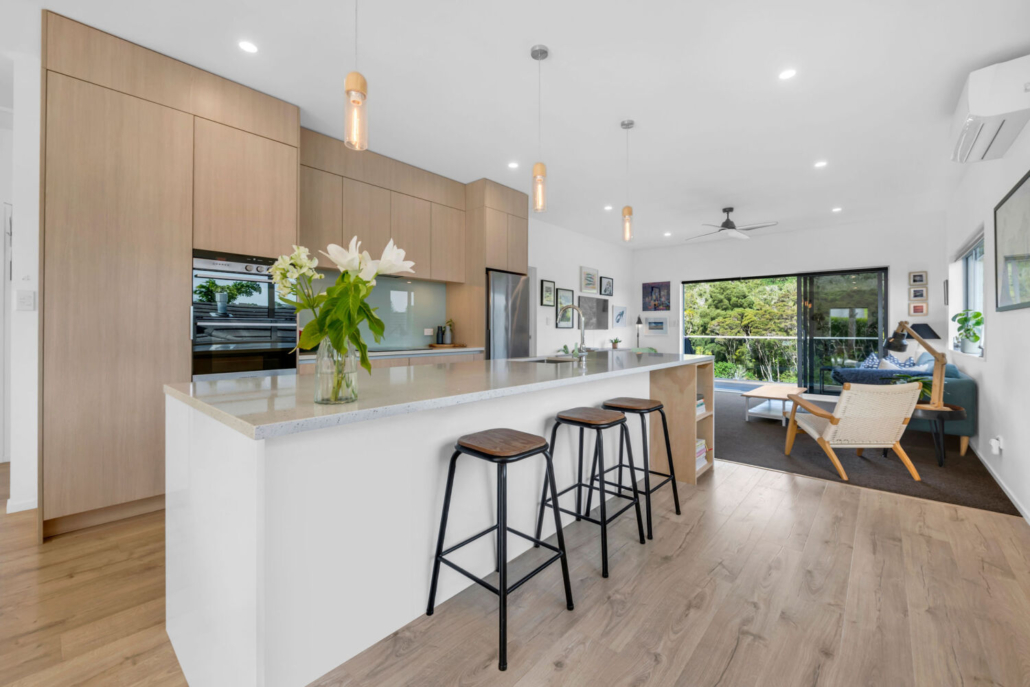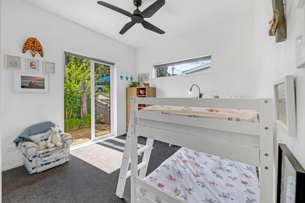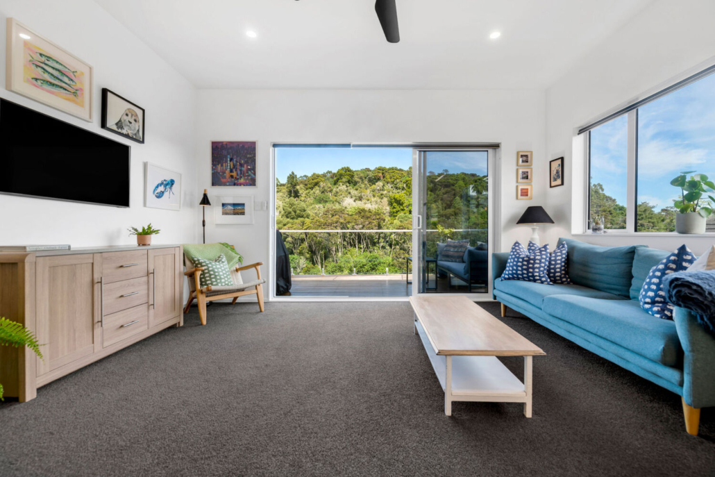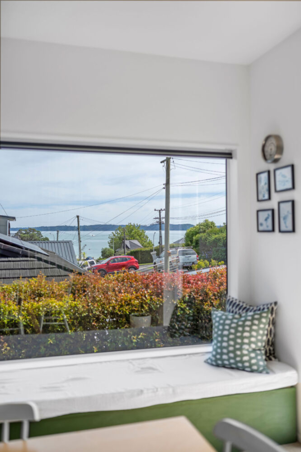Effortless indoor-outdoor flow connects the living areas with multiple decking options. The eastern deck enjoys morning sun and sea views, while the western deck soaks up the afternoon light and presents stunning views of the neighbouring reserve filled with native bush and birdlife — truly pictures of delight at every turn.