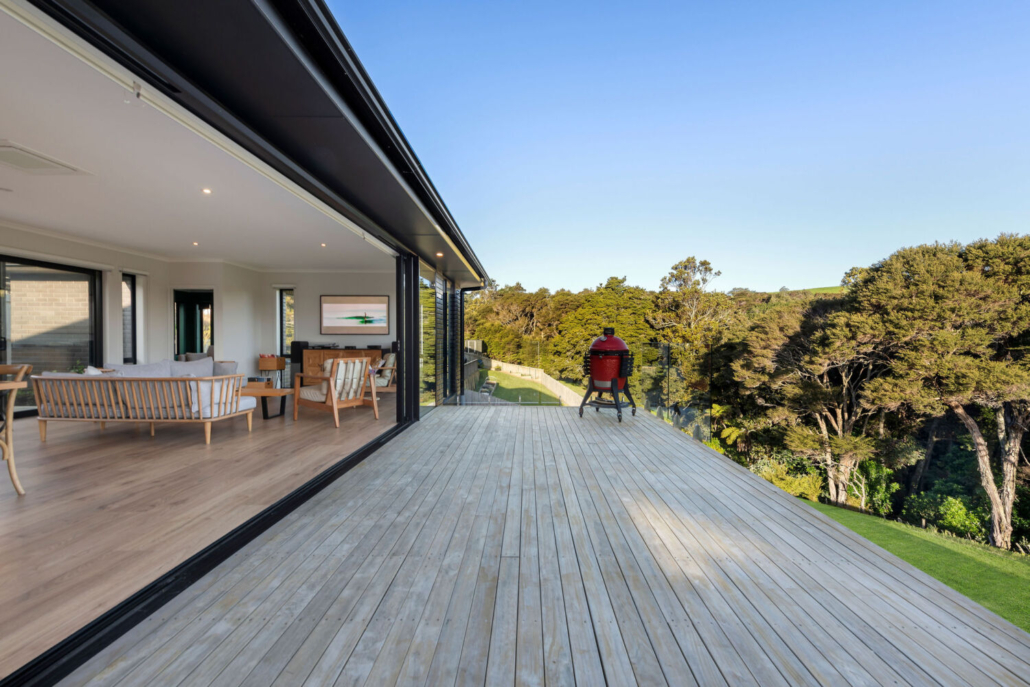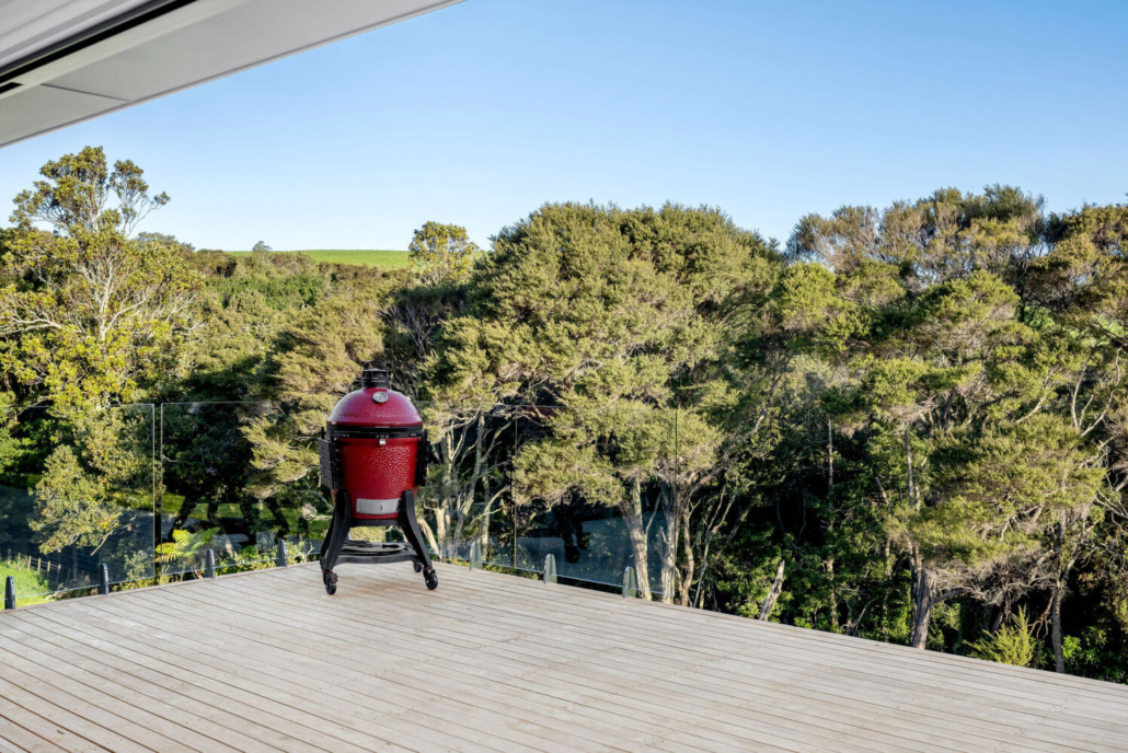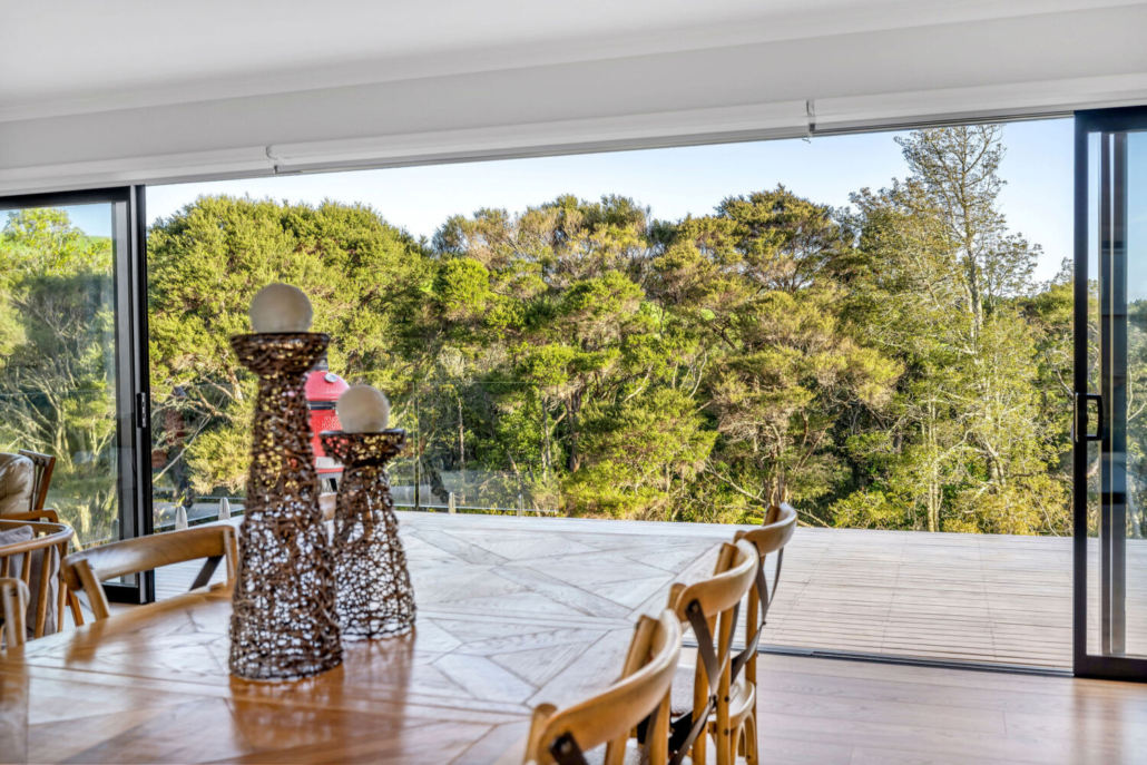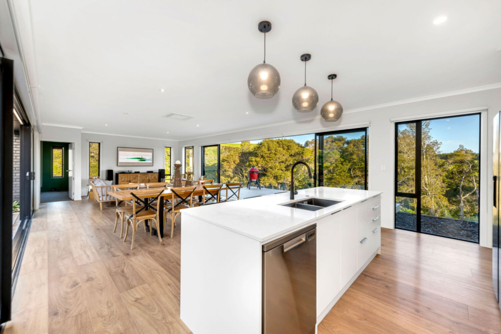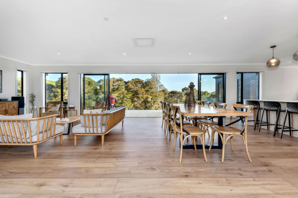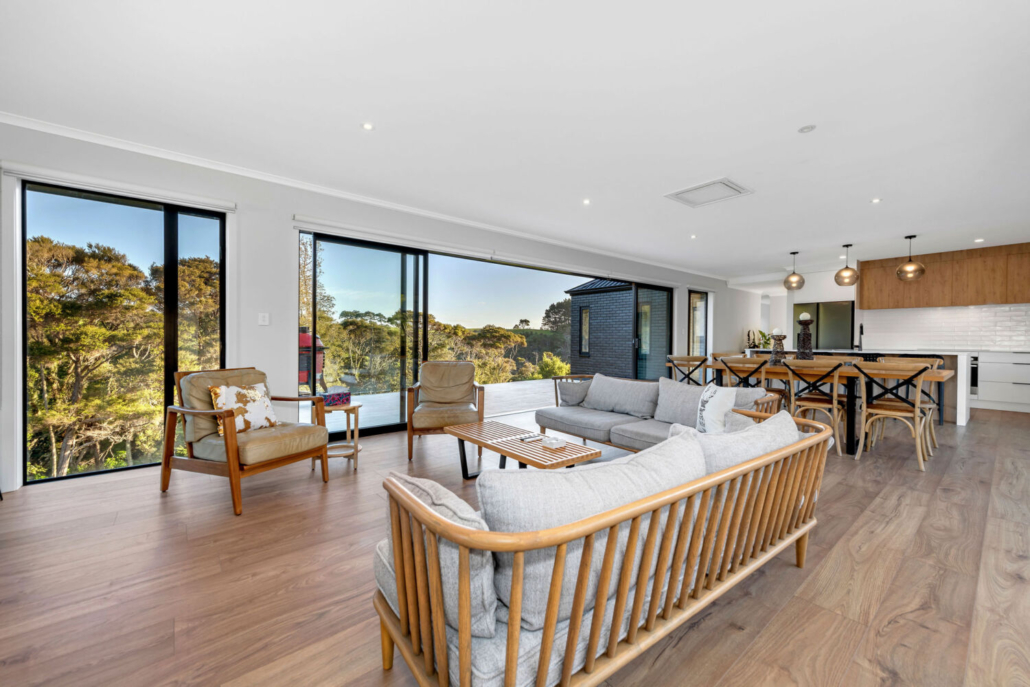 With four bedrooms and two bathrooms, including a master suite with ensuite and walk-in wardrobe, the layout is designed for both ease and practicality. The open-plan kitchen, dining, and living space unfolds effortlessly, with sliding doors on both sides that create an easy connection to the outdoors. Step out to either a private concrete patio or expansive decking that frames tranquil views of native bush and farmland.