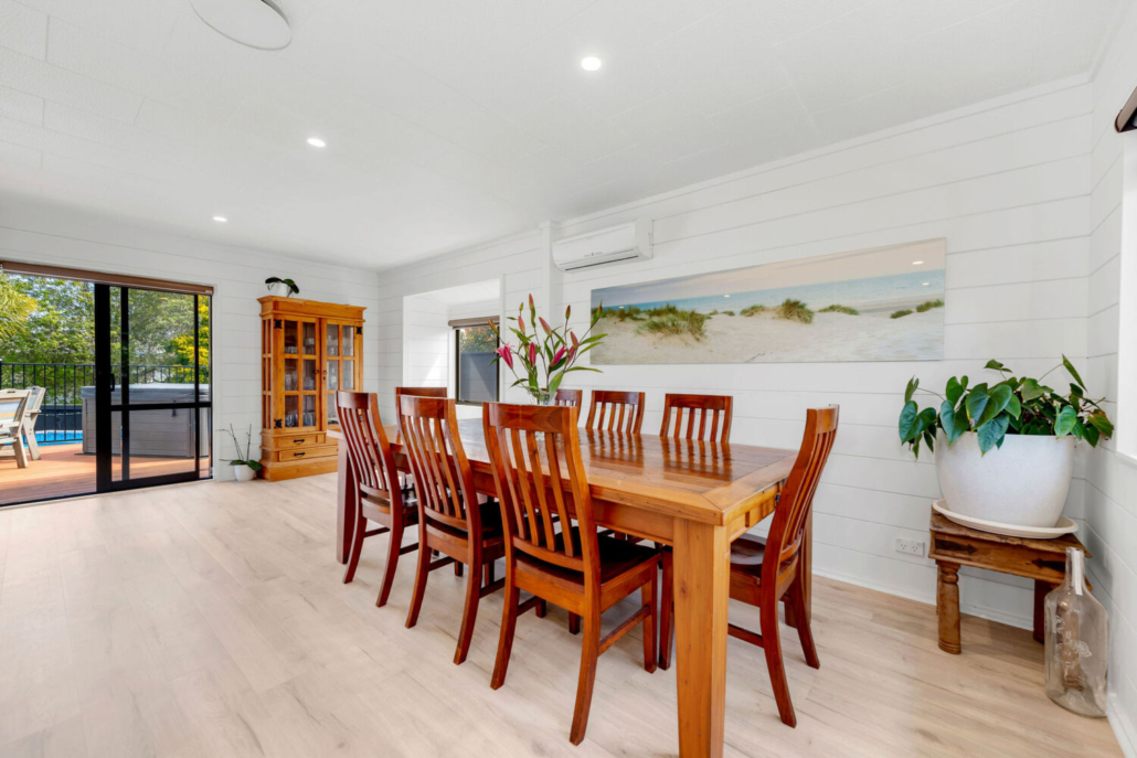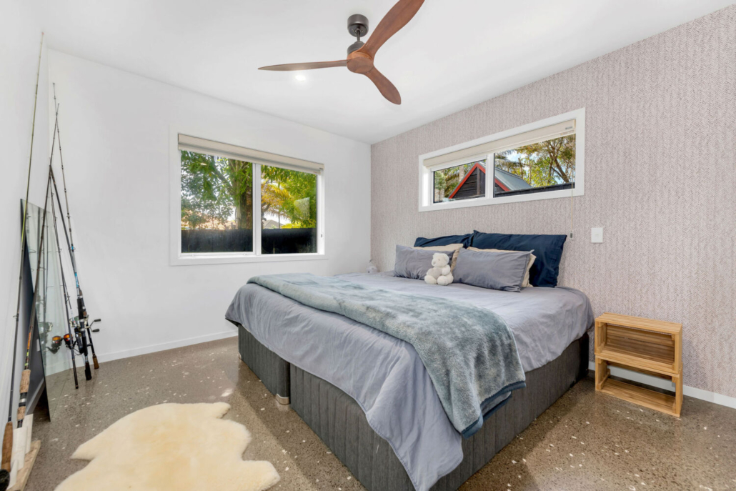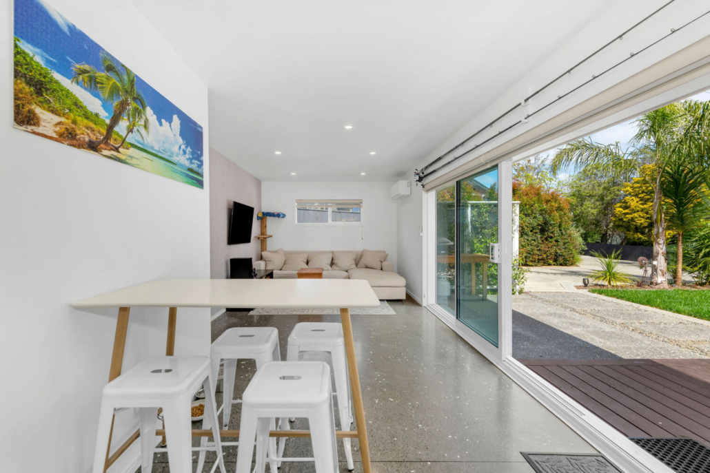 The main home blends a relaxed, rustic beachy feel with thoughtful updates. Three bedrooms share a main bathroom and separate WC, while an open-plan kitchen, dining and lounge flow through sliding doors to sunny decking and a broad front lawn. Fresh flooring and paint give it a crisp new outlook, and a separate laundry and double garage add everyday ease.