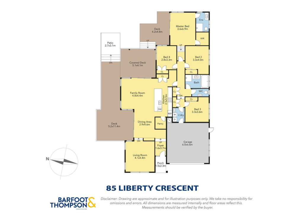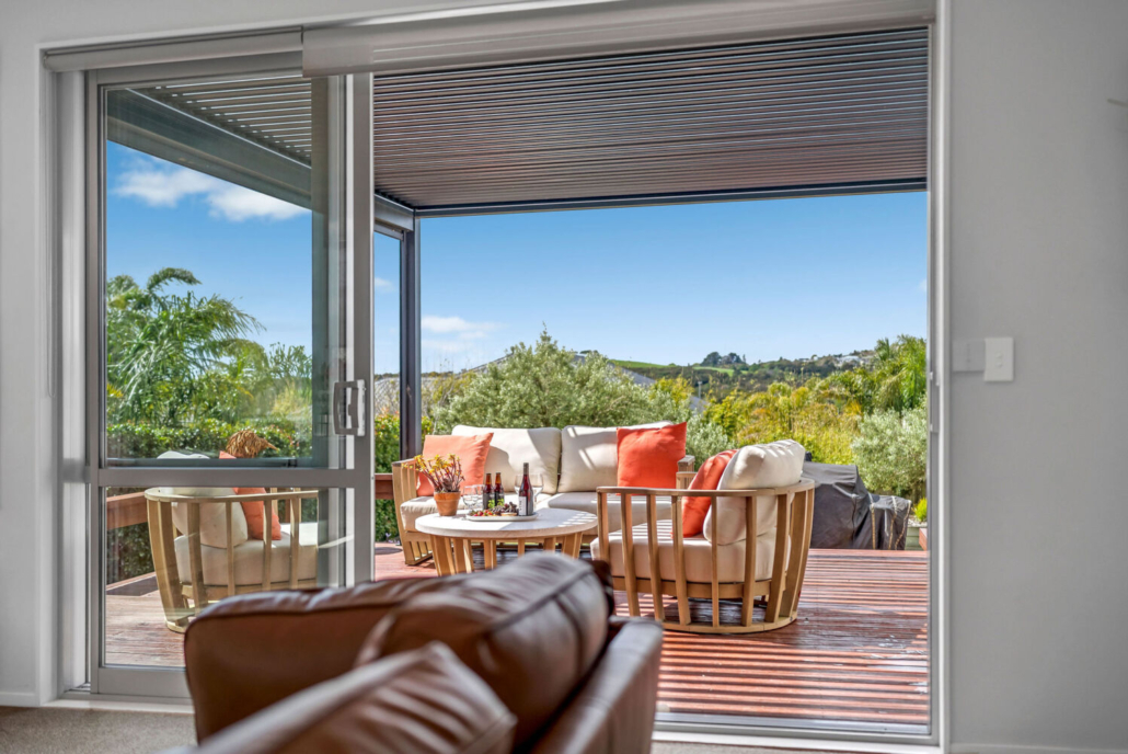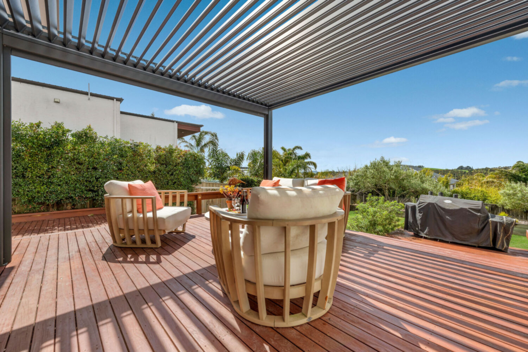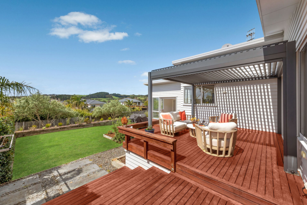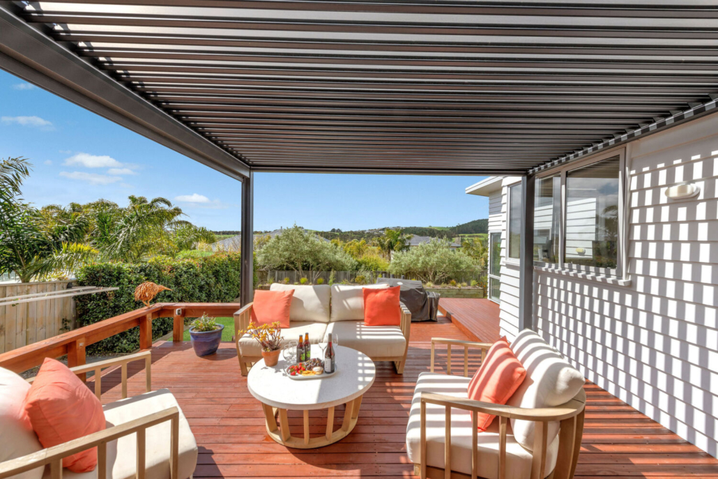 Central is the open-plan kitchen, complete with scullery and centre island that connects to designated living and dining spaces. Multiple sliding doors then unfold to decking that wraps around the north and eastern sides of the home. A recent addition is the electric louvered pergola with drop-down side which adds versatility for sunny mornings, relaxed afternoons, or entertaining with friends and family. The master bedroom also enjoys its own north-facing deck access, soaking up warmth and light. A second living area provides space for growing families while recent updates to flooring and landscaping ensure the home is move-in ready.
